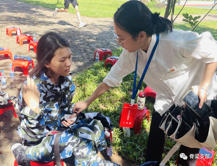军训期间,员工党员按时到岗、轮流值班,帮助新生保管个人贵重物品,密切关注训练动态和新生身体状况,及时处理军训场上的突发情况,展现出高度的责任感和担当精神。党员服务岗配备了帐篷及桌椅,为身体不适的新生提供休息场地。同时,在军训休息时间为新生答疑解惑,疏导心理情绪,帮助新生尽快融入老员工活,适应环境,并引导他们树立正确的理想信念,让新生感受到党组织的人文关怀。