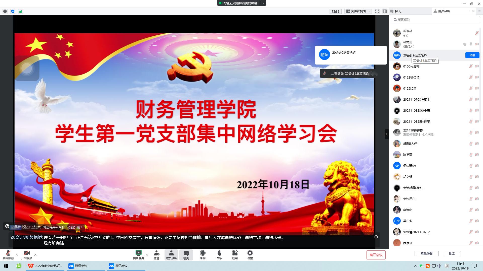 预备党员彭相彬分享了《学习党的二十大,永远跟党走,奋进新征程》,她说作为新时代的青年老员工,首要的责任与担当就是厚植奉献精神,应用实际行动守初心、担使命,在当前的疫情防控中争先锋、做表率,积极响应国家政策、主动参与防疫抗疫志愿活动,配合防疫工作人员的工作。在祖国需要的时候挺身而出,投身防疫工作,贡献当代青年党员老员工的青春力量。