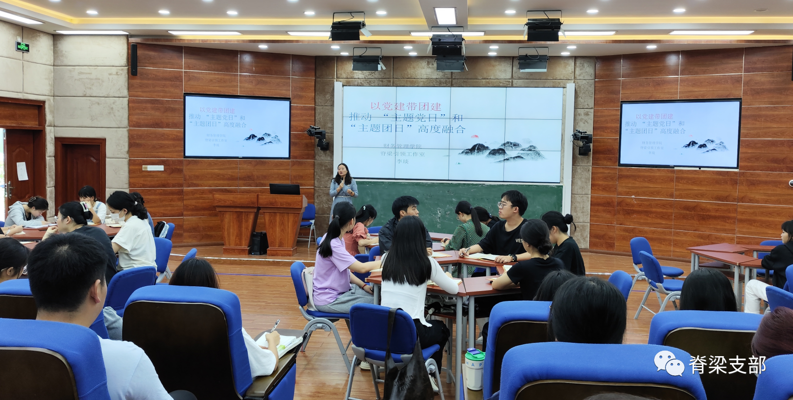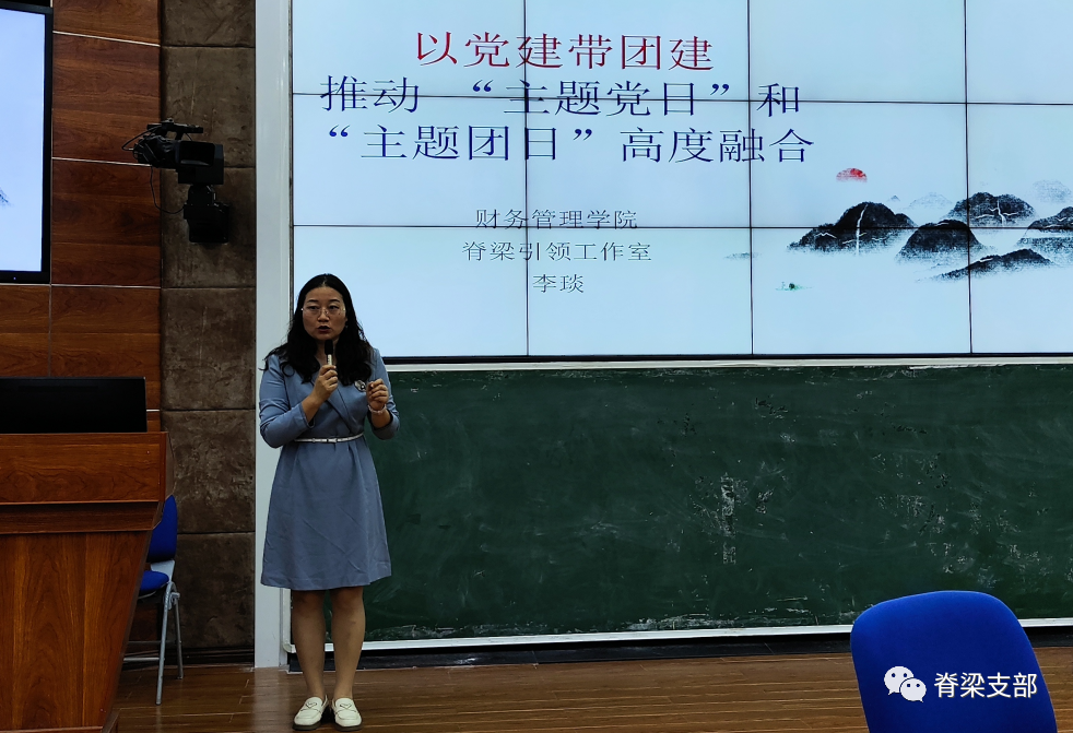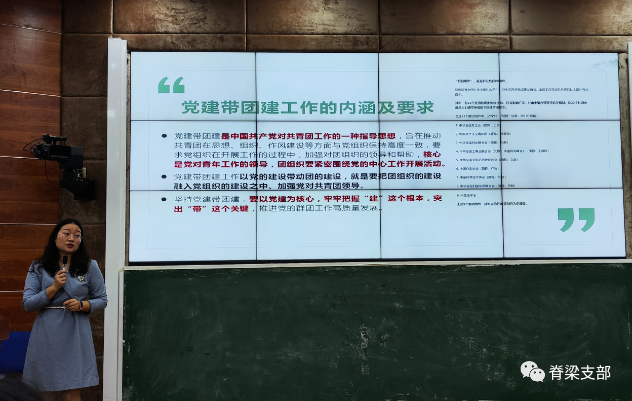 李琰说,党建带团建是中国共产党对共青团工作的一种指导思想,旨在推动共青团在思想、组织、作风建设等方面与党组织保持高度一致,核心是党对青年工作的领导。她强调,坚持党建带团建,要以党建为核心,牢牢把握“建”这个根本,突出“带”这个关键,推进党的群团工作高质量发展。她从活动前期策划、活动现场布置、活动内容呈现、活动后期跟进等四个方面提出了推动“主题党日”和“主题团日”高度融合。