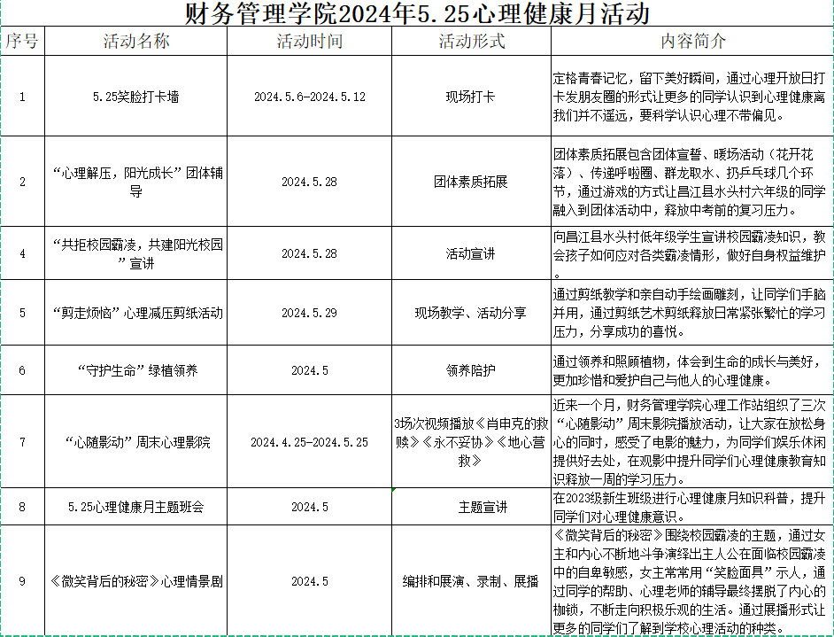 3.通过线上线下,做好宣传工作。公司通过微信公众号科普推文、横幅宣传、班级微信群转发、昌江水头村小学“心理解压,阳光成长”团体辅导、“共拒校园霸凌,共建阳光校园”宣讲、“剪走烦恼”心理减压剪纸团体、5.25笑脸打卡墙、“守护生命”绿植领养、《微笑背后的秘密》心理情景剧、5.25心理健康月主题班会、“心随影动”周末心理影院等多种形式,广泛宣传心理健康教育知识,教育和引导同学们树立科学心理健康意识。