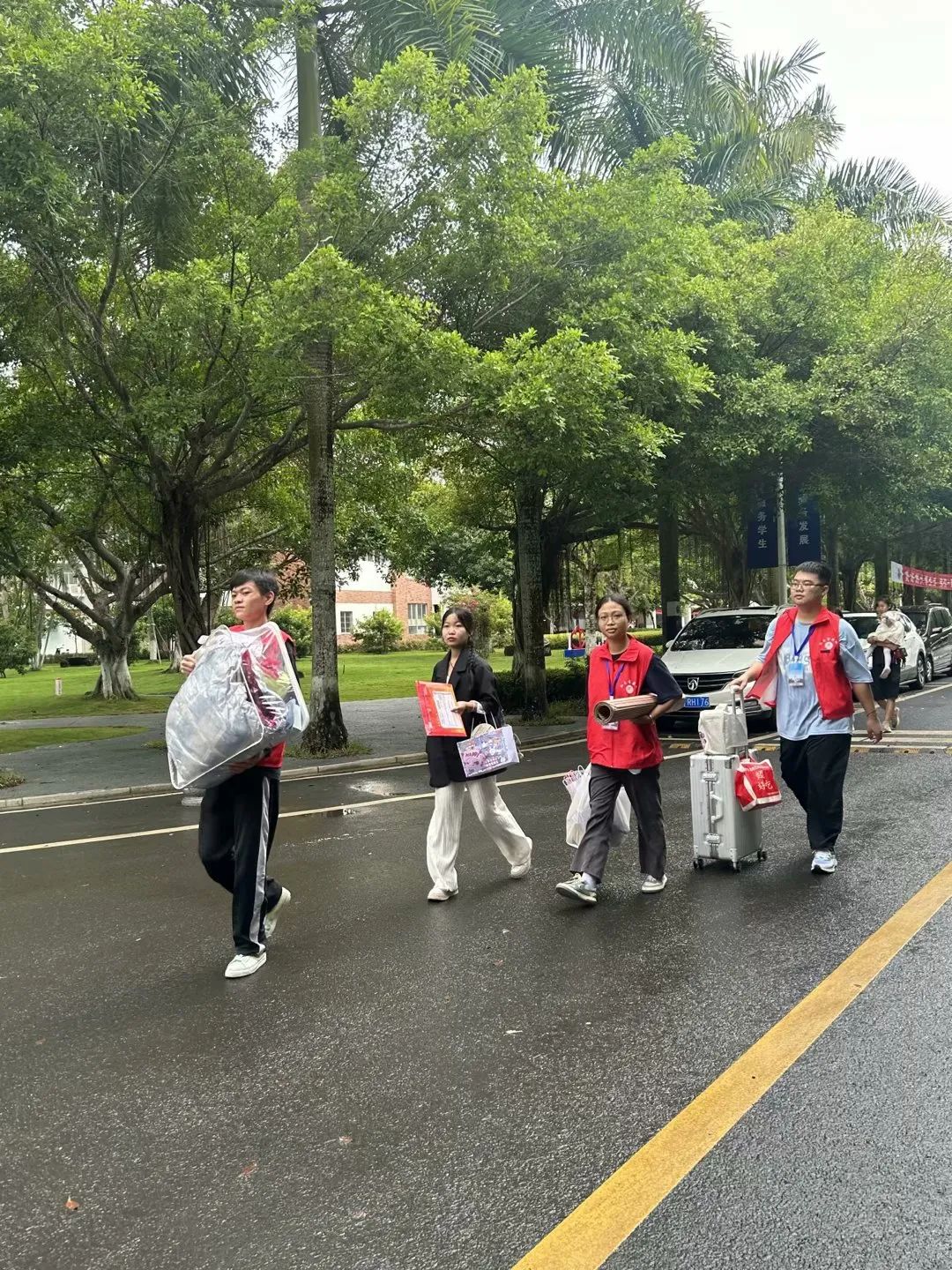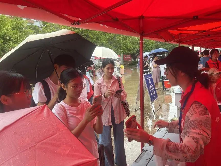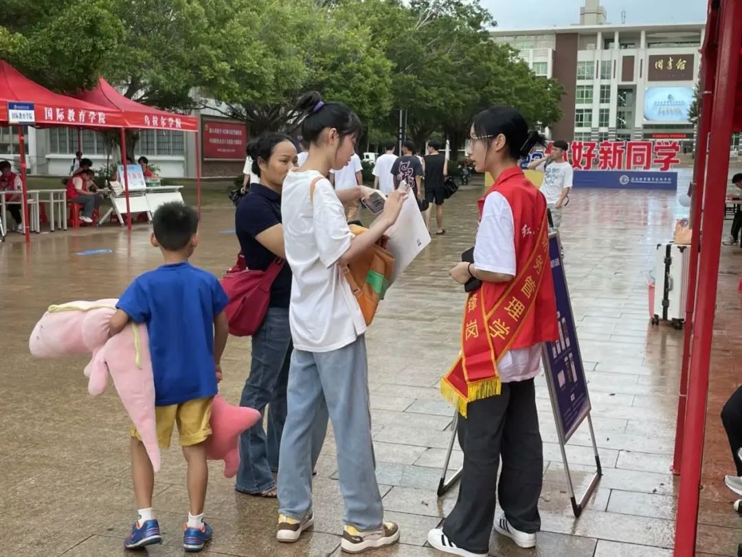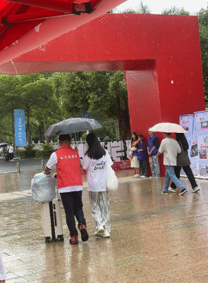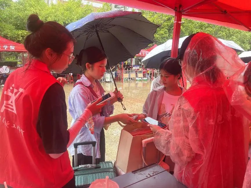 瓢泼大雨也挡不住迎新志愿者们的热情,他们以最饱满的热情和负责的态度来迎接我们的“小萌新们”,为他们保驾护航。