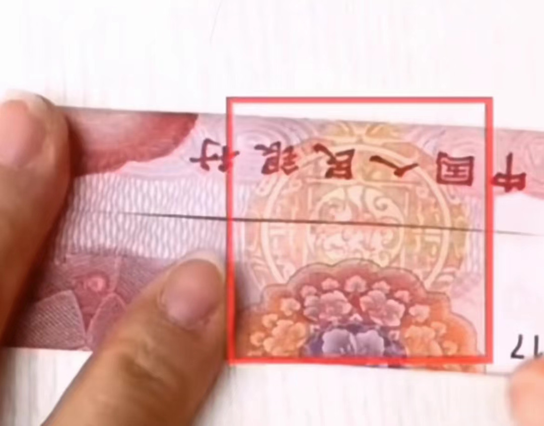 (2)将人民币左右对折,可以看到椭圆形能完美拼接。