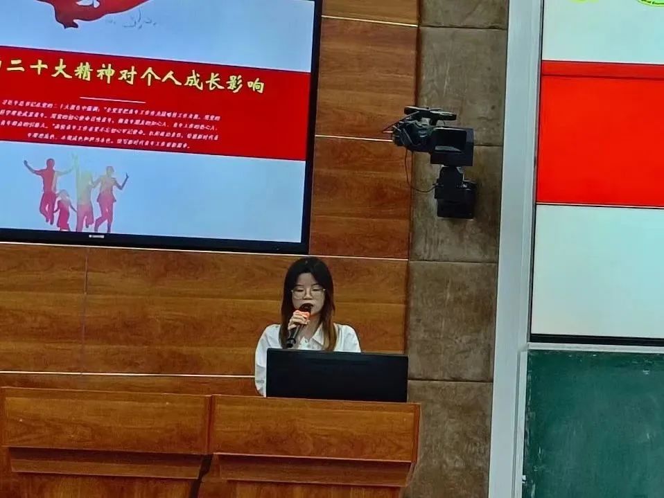 程思欣同学带我们回顾了党的二十大精神,她讲到“新时代新青年,我们要积极践行社会主义核心价值观,提升个人素质,参与志愿服务活动等小事做起,投身祖国建设事业,实现人生价值,为祖国建设事业贡献智慧和力量。”