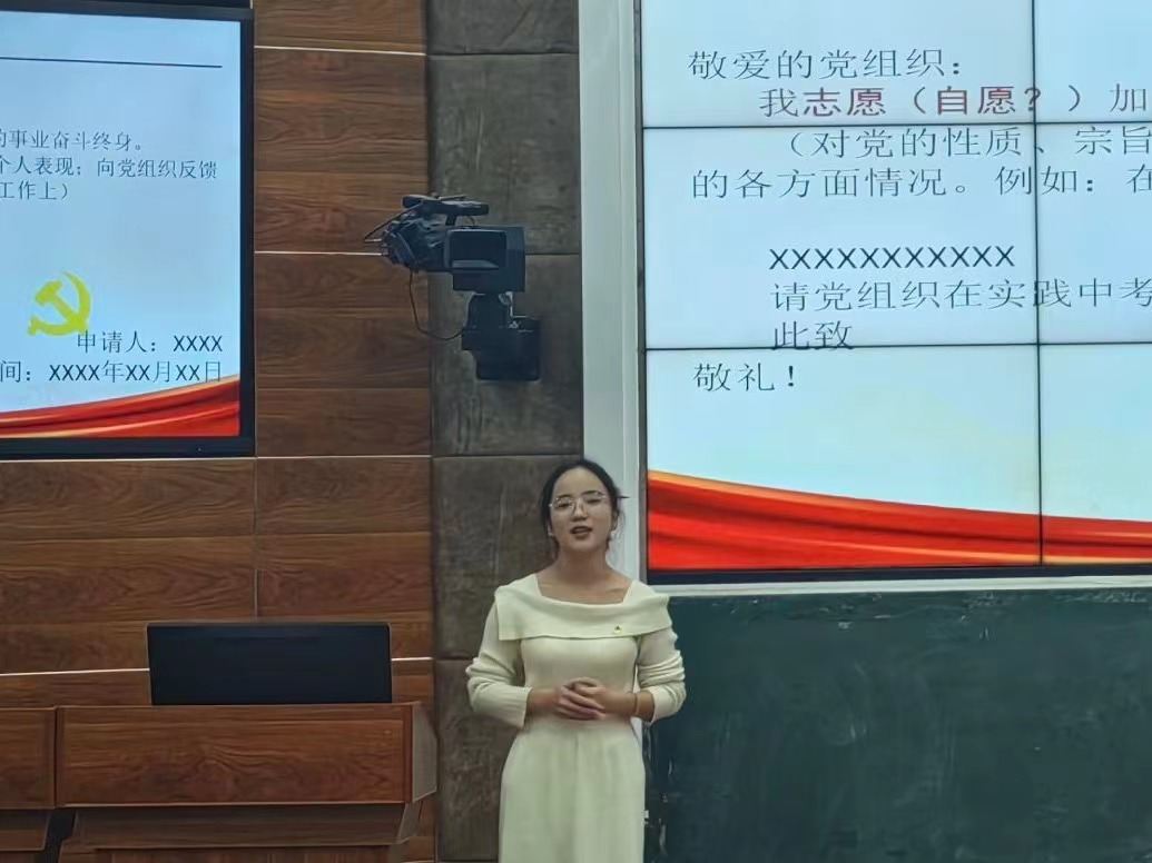 李琰同学介绍了入党申请书的格式和要求、以及优先入党的条件,使我们更进一步认识和了解到入党要求,更能正确认识到自己的入党动机。
