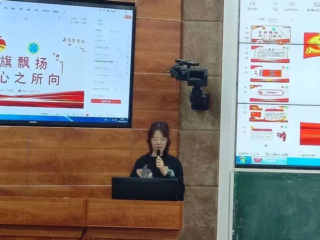 马玉菲同学介绍党旗的由来、演变过程以及使用场合,她讲到党旗的意义在于象征一个政党的理念、目标和价值观,能够团结和凝聚党员和支持者,激励和鼓舞我们为实现党的目标而奋斗。