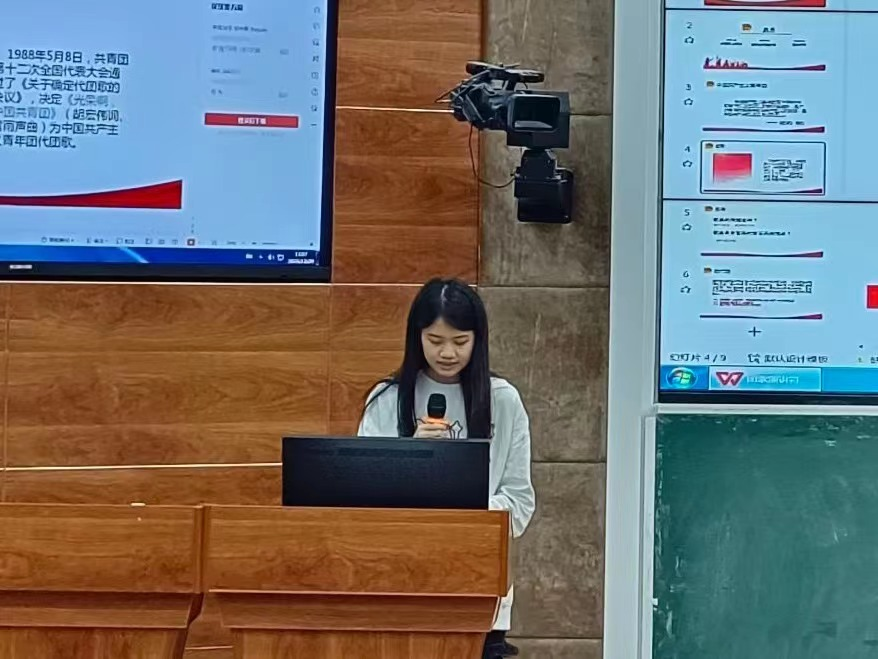 符春妹同学介绍了中国共产主义青年团团歌的背景以及发展由来,通过引入故事的方式让给我们更加了解中国共产主义青年团团歌发展的历史,更进一步了解团歌和唱团歌时激昂的心情。