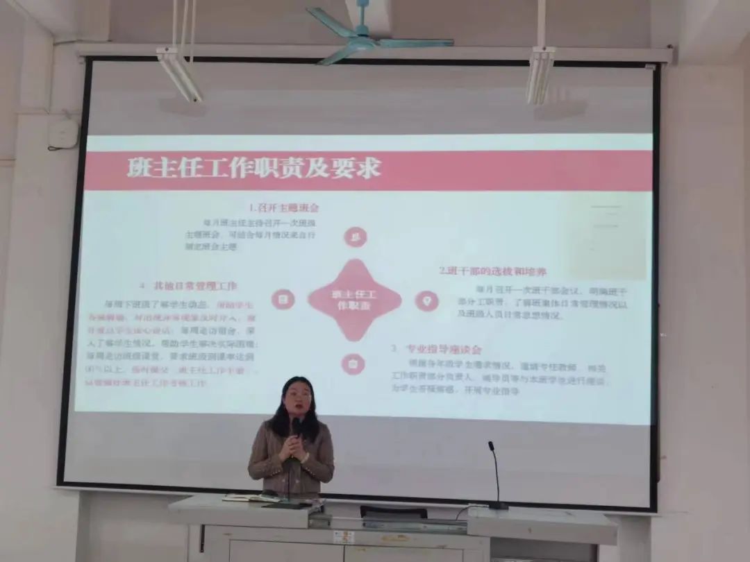 在会议中,李琰副书记肯定了班主任的辛勤付出,与此同时,也对班主任的工作职责提出了四点要求:第一是及时召开主题班会,每月班主任主持召开一次班级主题班会,可结合每月情况来自行制定班会主题;第二是班干部的选择和培养,每月需要召开一次班干部会议,明确班干部分工职责,了解班集体日常管理情况以及班级人员日常思想情况;第三是召开专业指导座谈会,根据各年级员工需求情况,聘请专任教师,相关工作职责部分负责人,辅导员等与本班员工进行座谈,为员工答疑解惑,开展专业指导;第四就是其他日常管理工作,例如帮助员工答疑解惑,走访宿舍,走访班级,与员工谈心谈话等等,并按时提交班主任手册。