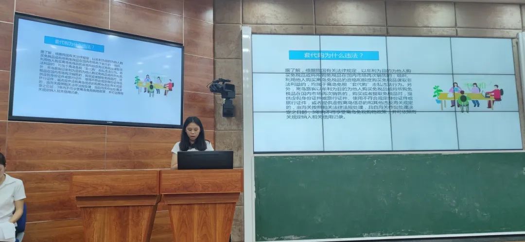 宣讲团成员用生动朴实的语言,介绍了离岛免税购物政策和相关法律法规,结合海南近期发生的“套代购”违法犯罪典型案例,从什么是“套代购”、离岛免税政策、“套代购”为什么违法、 “套代购”走私后果、如何抵制“套代购”五个方面为同学们上了一堂生动形象的反走私法律知识科普课。宣讲团向同学们分析了“套代购”走私的后果以及所应承担的责任,告诫同学们提高防范意识,远离“套代购”,切勿以身试法,坚决向“套代购”说不。