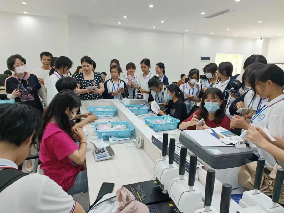 金融教研室负责人陈希西老师为中职员工介绍了目前实务中常用的扇型点钞法和手持式点钞法。扇型点钞法有开伞、清点、记数,墩齐、扎把环节。手持式点钞法,多用四指四张点钞法,也叫四指拨动点钞法,即用右手小指、无名指、中指、食指依次各点一张,轮回清点,该方法速度快、点数准,轻松省力。接着符寸藤、卓佳佳、钱安琪、李晓茹四位员工为中职公司师生展示点钞技能,大家都为四位学长的速度感到惊叹。目前,bevictor1946韦德官网金融专业员工的点钞速度在一分钟300张钞票。若以每一百张纸钞为一捆,我们员工至少能在10分钟内完成24捆,清点完2800张钞票,并完成盖章。陈希西老师还为中职员工介绍小键盘录入、字符录入以及货币识别等手工技能。中职员工对技能十分感兴趣,纷纷请教陈希西老师点钞技巧,进行上手操作,久久不愿离开。