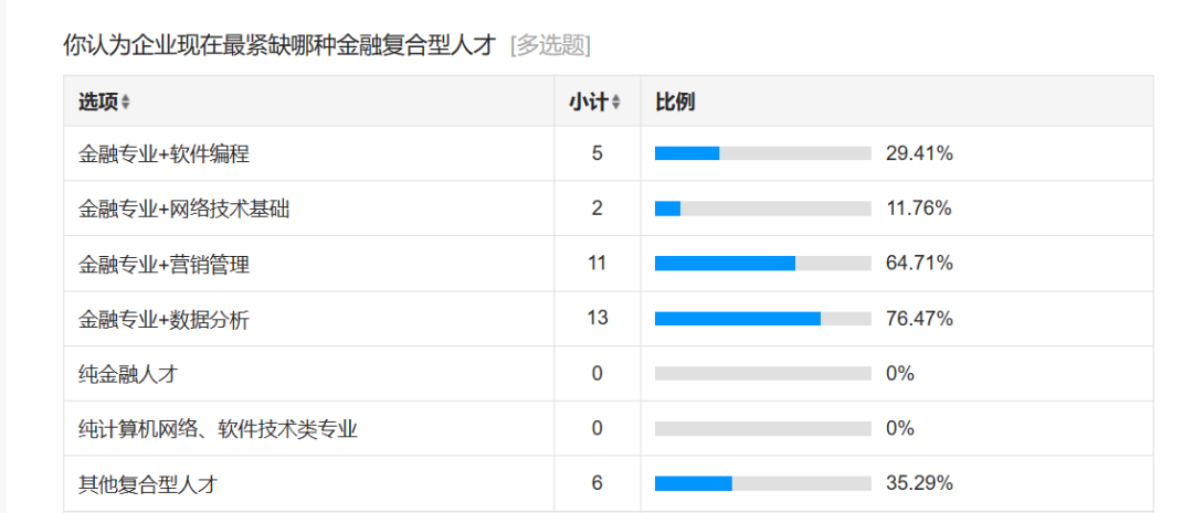 唐娜、谢杏、方俊芝、张若冠老师,通过线上问卷的形式,针对中国太平洋人寿保险股份有限公司、太平洋证券海口分公司、金元证券海口分公司等多家公司进行调研,发现目前公司最紧缺的是”金融专业+数据分析”类复合型人才;其次是“金融专业+营销管理”类复合型人才。
