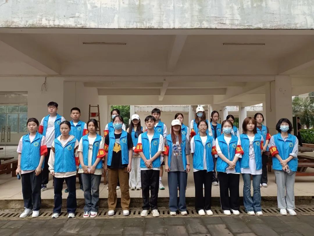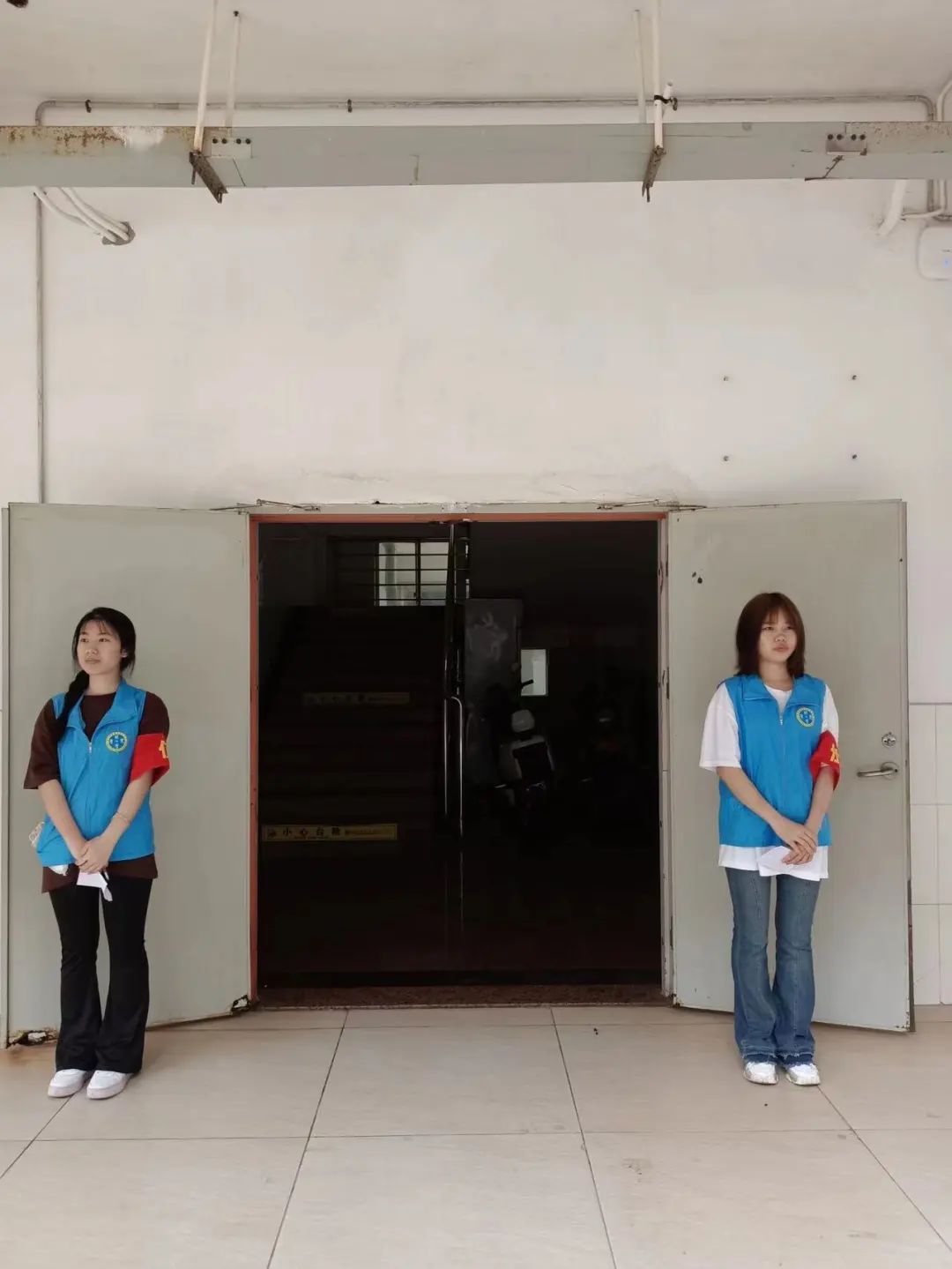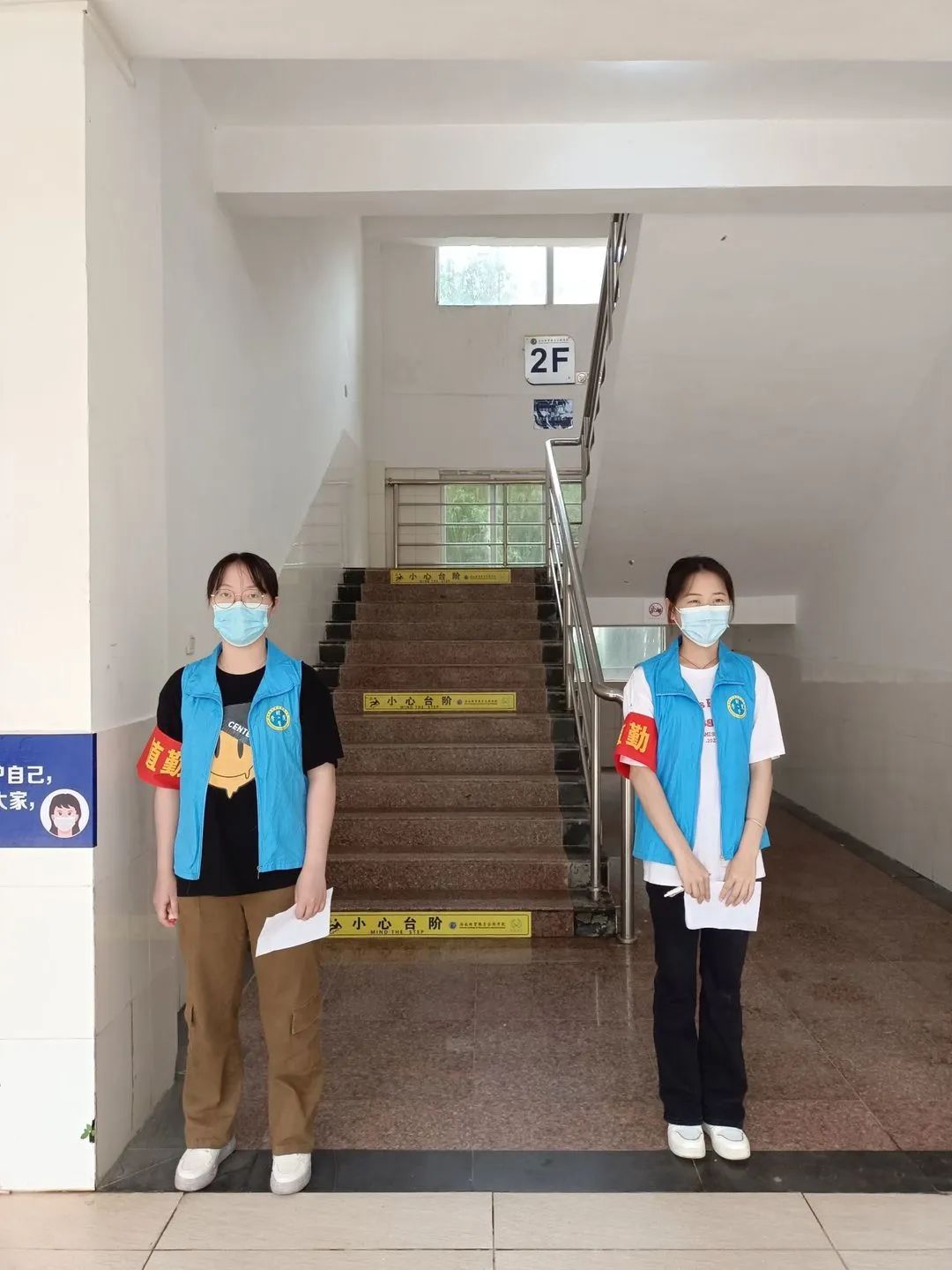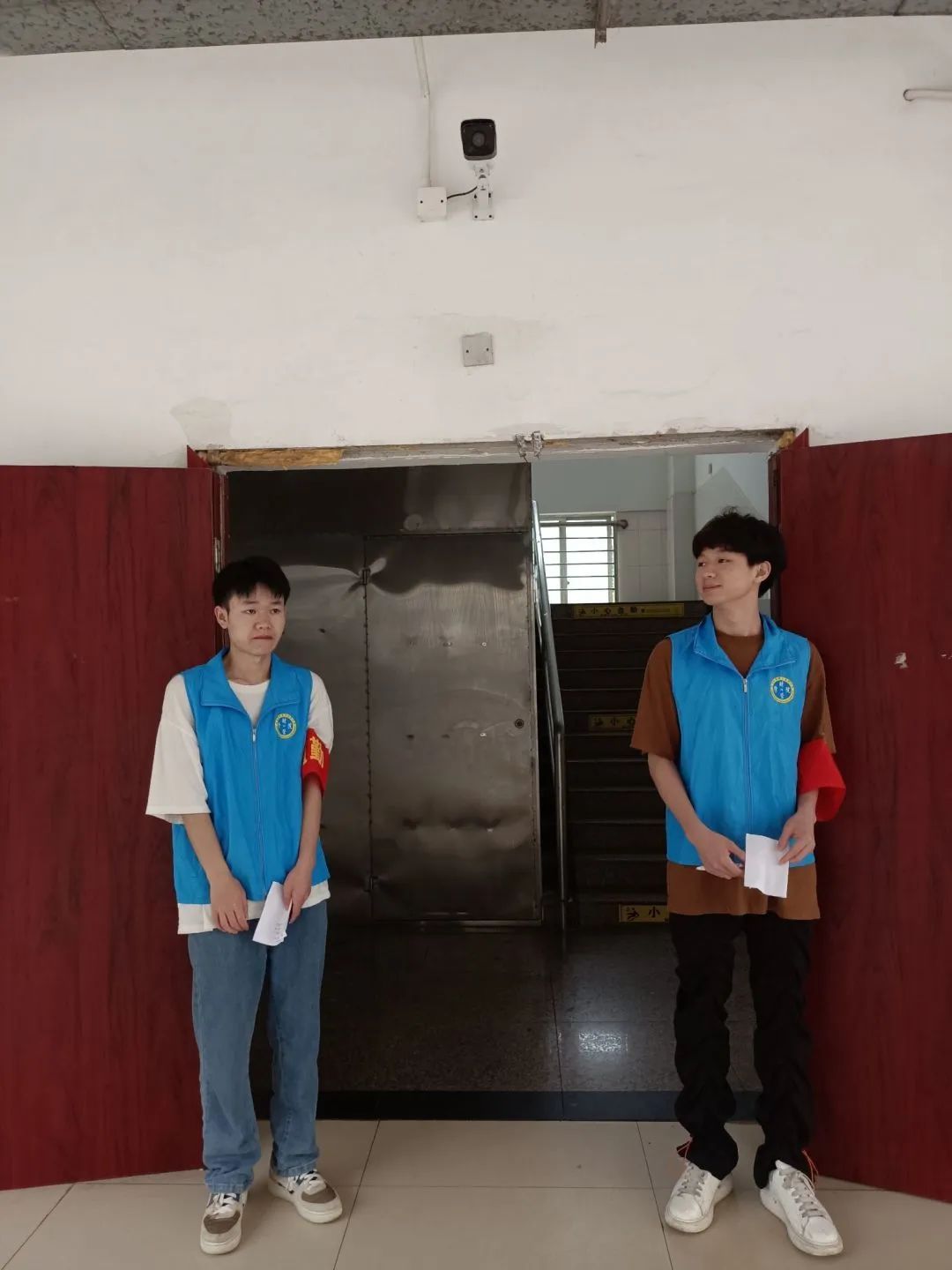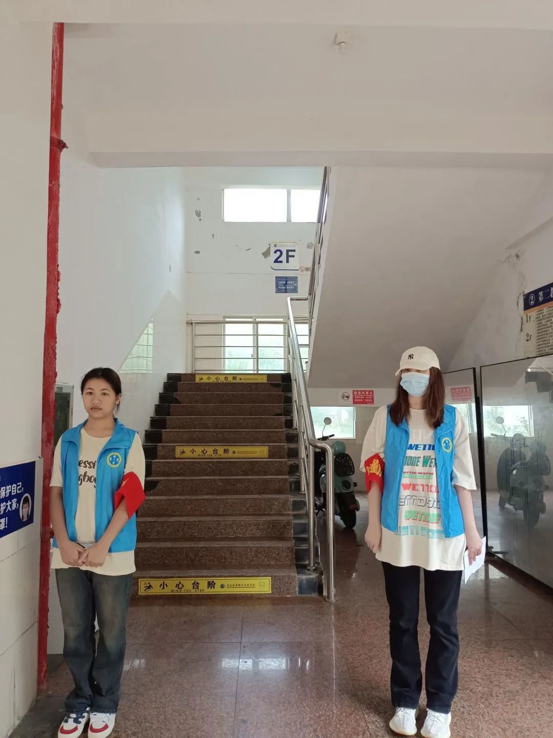 4月10日上午七点半,志愿者们在第二教学楼各个楼梯口检查同学们是否有穿拖鞋、穿背心、超短裤、超短裙以及带早餐进教室等不文明行为。