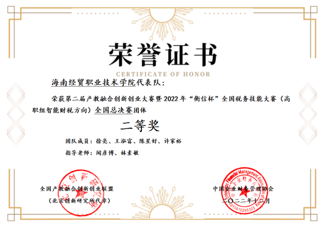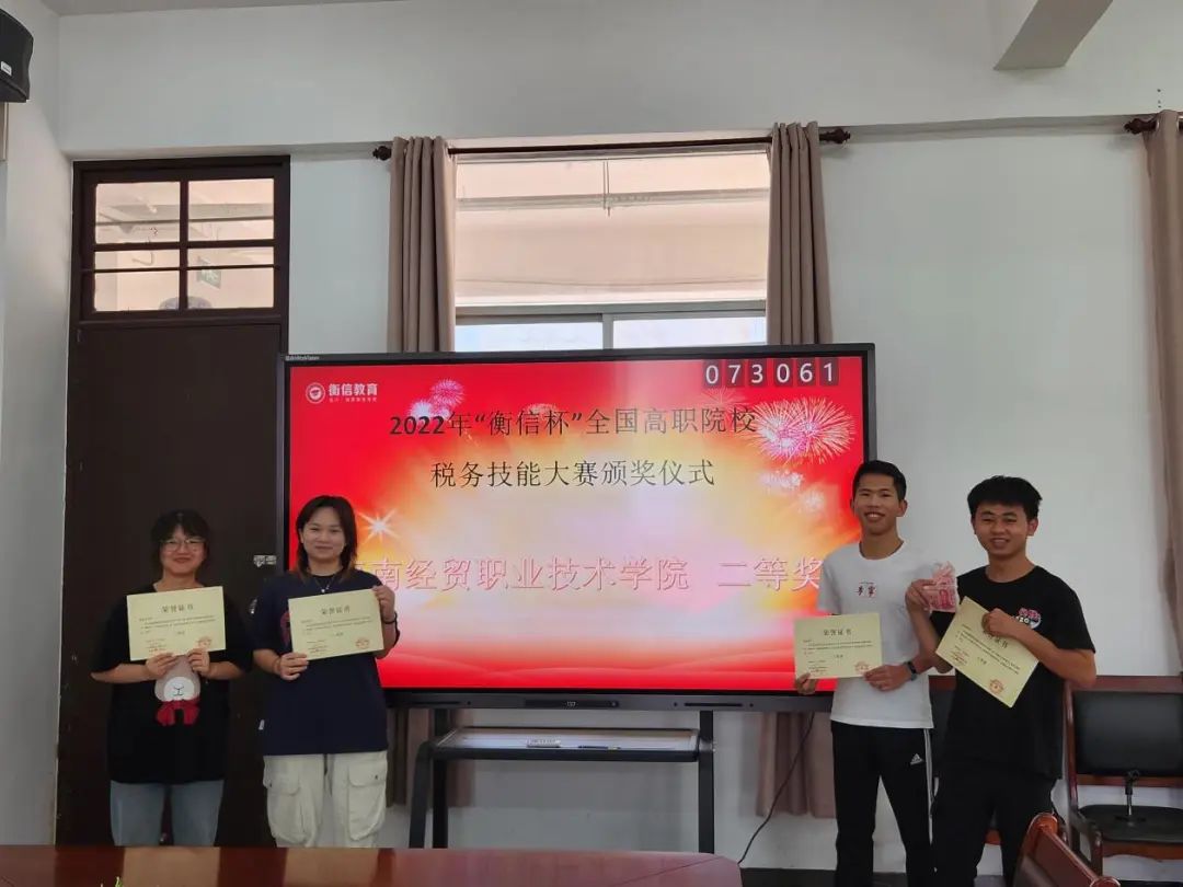 在2022年12月举办的第二届产教融合创新创业大赛暨2022年“衡信杯”全国税务技能大赛中,来自bevictor1946韦德官网的徐亮、王泓富、陈星好、许家裕四位同学组成的海南省代表队获得了全国二等奖、第十名的好成绩。2023年3月21日,衡信公司海南区域负责人王元总经理为大家送来了奖状及2000元团体奖金,并举行了线下颁奖典礼。