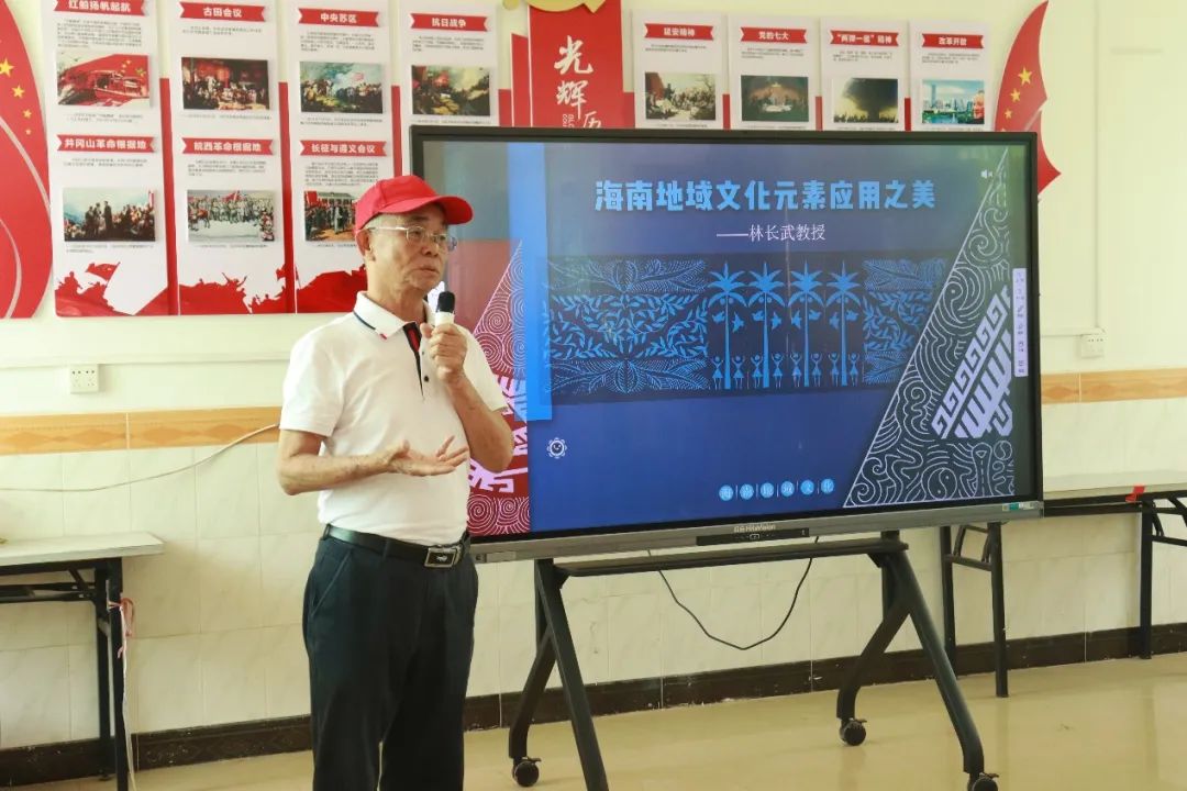 林长武教授以“海南地域文化元素应用之美”为题,别开生面地给师生们讲述一堂弘扬传统文化的讲座。他围绕海南特有的地域气候、民族特色、黎锦图案、植物品种等内容延伸出海南本土的元素符号,展现了海南特有的文化之美。