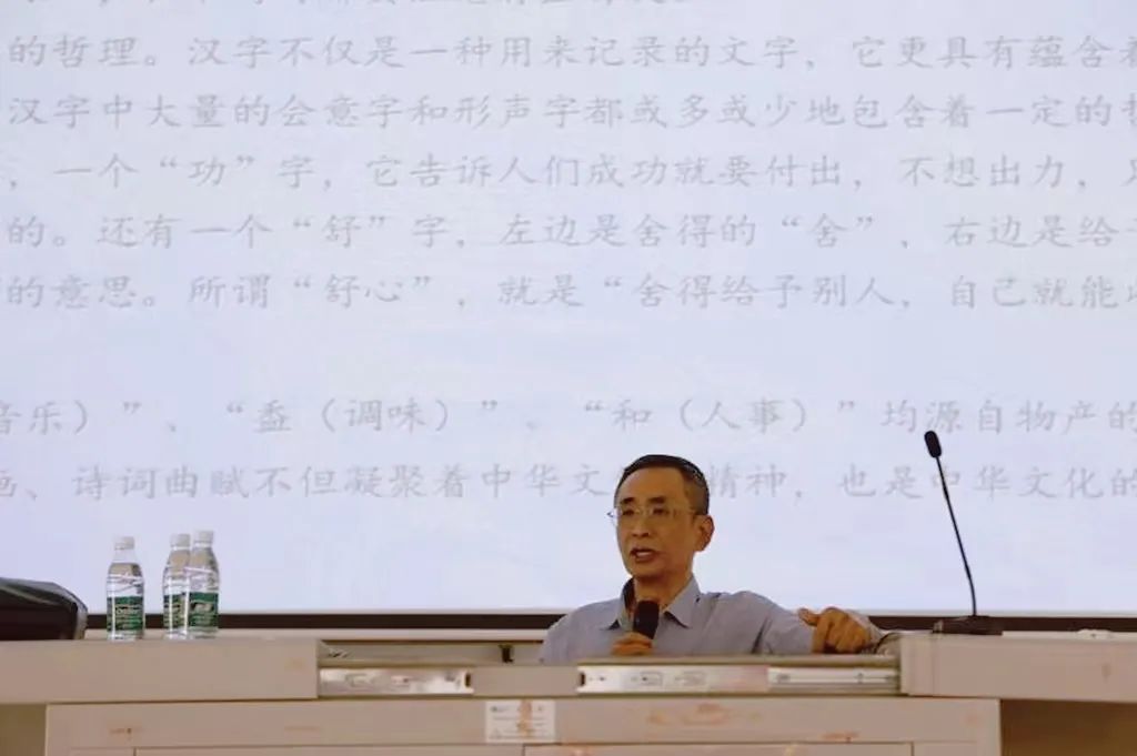 周国耀教授以《汉字、诸子百家与诗词:中华文明的精神与魅力》为主题,讲述了中国传统文化的基本精神和魅力。从汉字的产生及传承,蕴含的丰富哲理及魅力;到以唐诗的气度与韵律、宋词的唯美为代表,所反映出中华文化的表现形式与独特的审美情趣;再到以先秦诸子百家为代表的中国传统哲学精神,显示出了一个优秀民族思想的高度和文化内涵的博大精深。周教授以诗概之,总结了出中国优秀传统文化精神内涵: