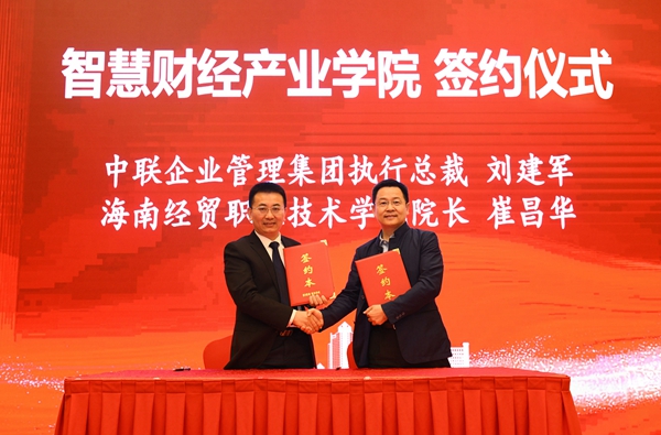在与会嘉宾的见证下,刘建军、张继友为产业公司揭牌。刘建军、崔昌华代表校企双方签署合作协议。邓艳芳、刘文斌为海经贸中联企业管理集团社会培训基地揭牌。