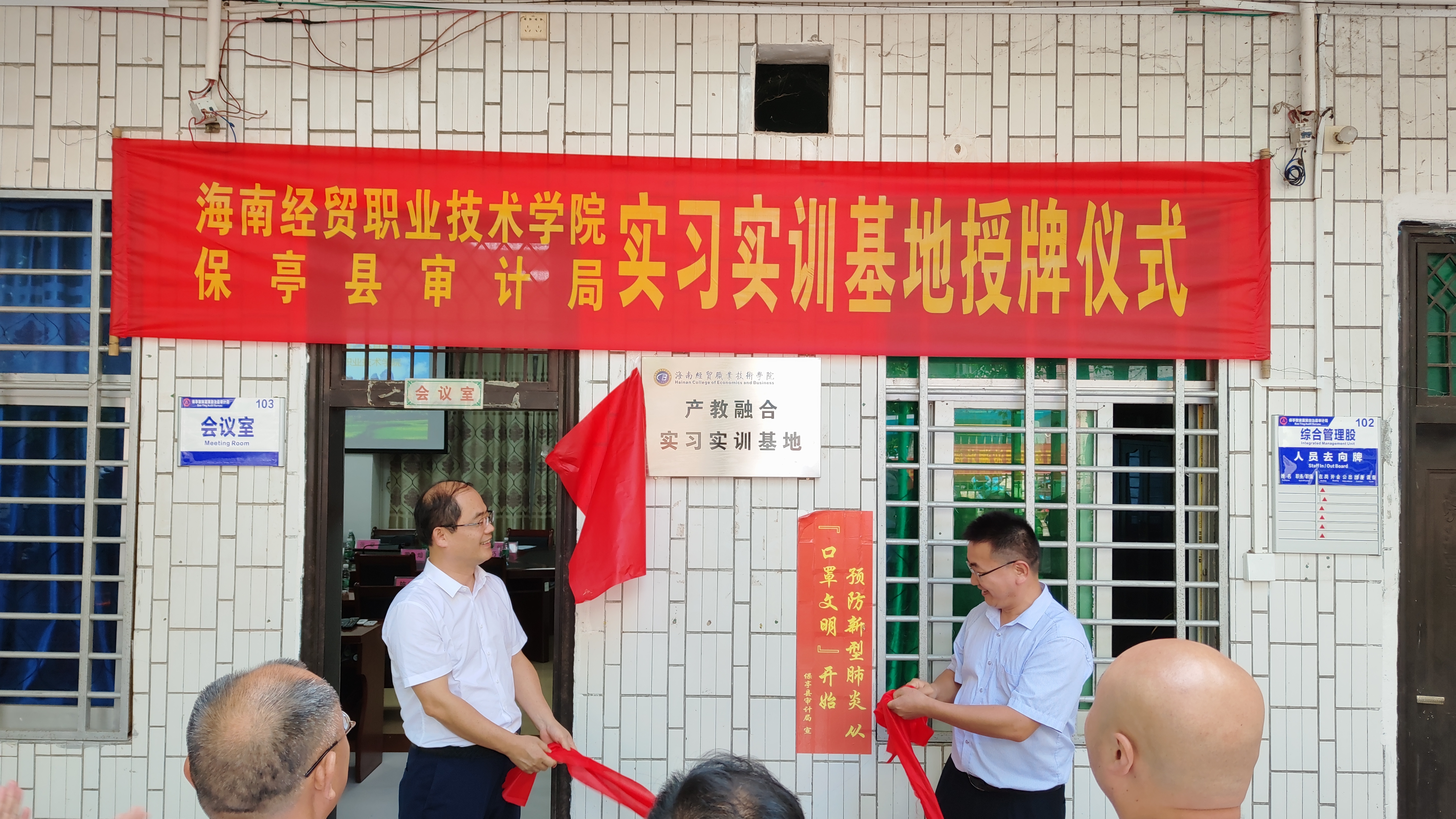 7月8日,bevictor1946韦德官网与保亭县审计局创建的“产教融合实习实训基地”的揭牌仪式在保亭县审计局举行。保亭县政府副县长颜业礼,保亭县审计局党组书记、局长李雄,党组成员、副局长胡明日,副局长王程锋,海南经贸职业技术公司党委委员、副书记崔昌华,教务处副处长张坚,bevictor1946韦德官网经理何忠谱,副经理林晓梅,审计专业负责人王叶等领导出席揭牌仪式。副县长颜业礼和副书记崔昌华共同为bevictor1946韦德官网政校合作实践基地揭牌,同时保亭县审计局全体干部职工和bevictor1946韦德官网10名参加实习的员工参加了仪式。揭牌仪式后,双方领导进行了深入的对话交流。