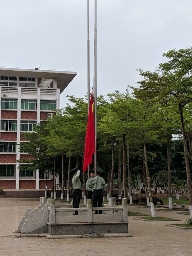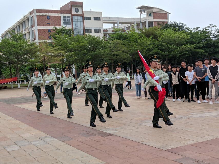 他们步伐一致,神情专注,将国旗护送至升旗台前,他们是英姿飒爽的国旗护卫队。广场上庄严的《义勇军进行曲》响起,全体师生共同注视着五星红旗冉冉升起。