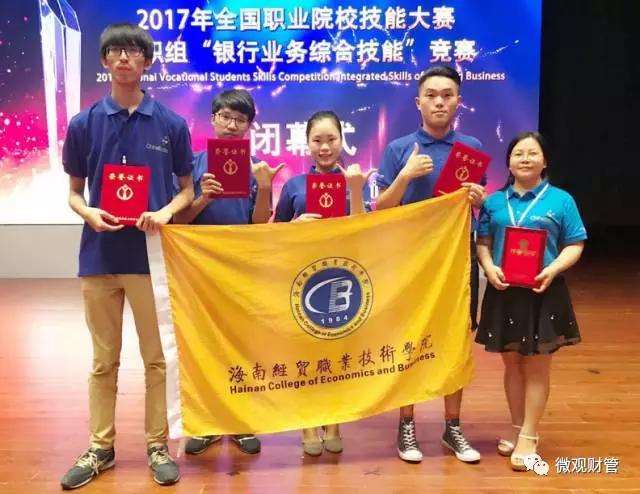 bevictor1946韦德官网15级投资与理财专业员工赵琴、谢松林、徐东明、林尔乃作为参赛选手组成代表队,在林晓梅、张先琪2位指导老师的共同指导下,4位选手积极备赛,不断挑战自我,勇攀技能高峰,最终克服重重困难,展现海南经贸学子风采,取得了二等奖第一名的优异成绩,从而也获得了展示项目资格。在“银行服务情景演练”展示项目中,海经贸代表队在赛场上充分发挥团队协作、永不言弃的精神,临时应变,又荣获2017年全国职业院校技能大赛高职组银行业务综合技能赛项“银行服务情景演练”项目优胜奖。