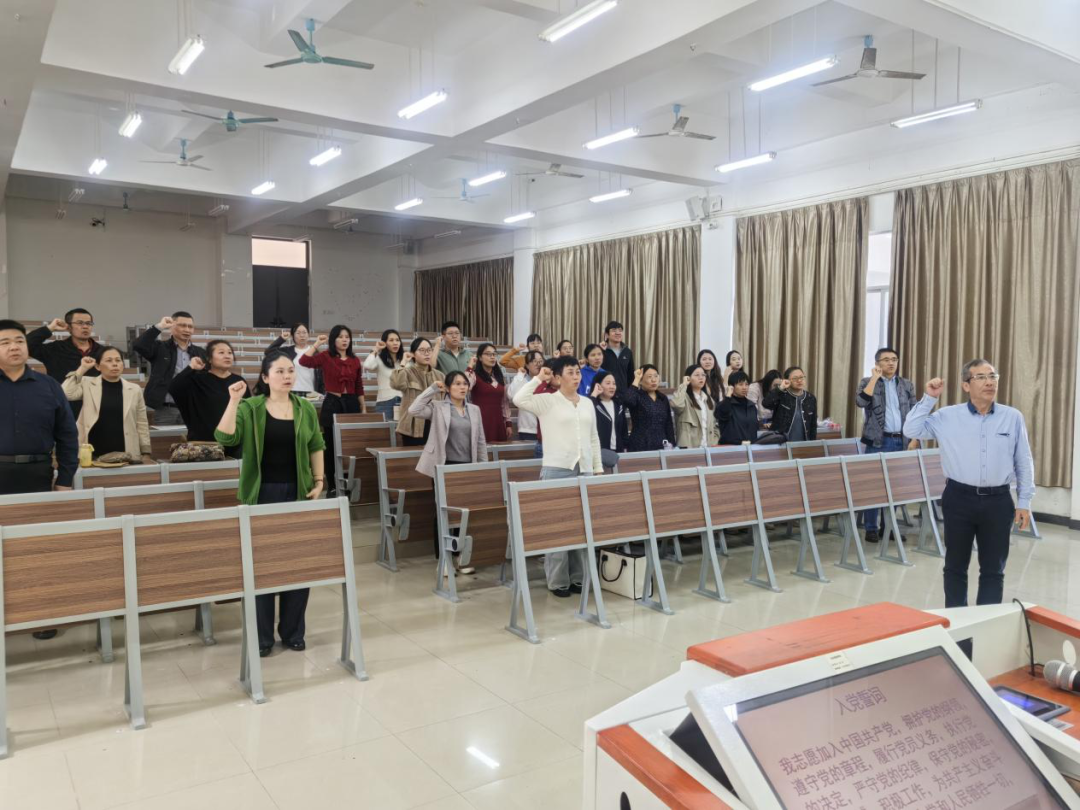 随后,在何忠谱的带领下,彭晨涵同志与全体党员一同面向党旗,庄严宣誓,重温入党誓词。