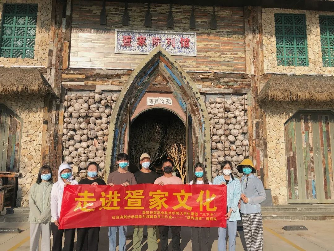 8月23日,实践团队抵达赤岭村,前往疍家陈列馆和疍家民俗馆参观。这里记载着疍家人以前生活、工作和休闲娱乐的情景。一段段文字、一张张照片、一座座雕塑让实践团队对疍家人历史的了解更加清晰起来。据展览馆工作人员的讲解中发现旧时代的疍家婚礼与我们现代汉人的婚礼有所不同,疍家婚礼要在水上接亲,在长期的生产生活中,疍家人形成自己独特的生活习俗习俗和风土文化,常见的文化活动是唱咸水歌,最具特色的是疍家婚礼。疍家婚俗中至今保留着新娘面临与父母分离而哭唱几天才出嫁的“叹家如"曲调,对新郎进行家庭教育的“喃伴郎”两大咸水歌系列。接亲过程中“玩媳妇”也独具海上特色,接亲后娘家人扯着船缆绳挽留新娘、与艄公进行“小艇拔河”,艄公们在同一小艇上反方向的“对划龙舟”,艄公把船摇得左右晃荡的“碌艇”.....这些“闹洞房”式的嬉戏把新郎新娘弄得头晕目眩,向人们证明了新郎新娘的海上劳作能力。实践团队居住的民宿也是疍家人经营的,站在民宿门前的栈道上,可以观赏落日晚霞,感受海风轻抚脸庞,还可以远望对面的三亚海棠湾,仿佛进入了桃花源,远离城市的喧闹声,慢慢地感受海风,让心灵平静下来。