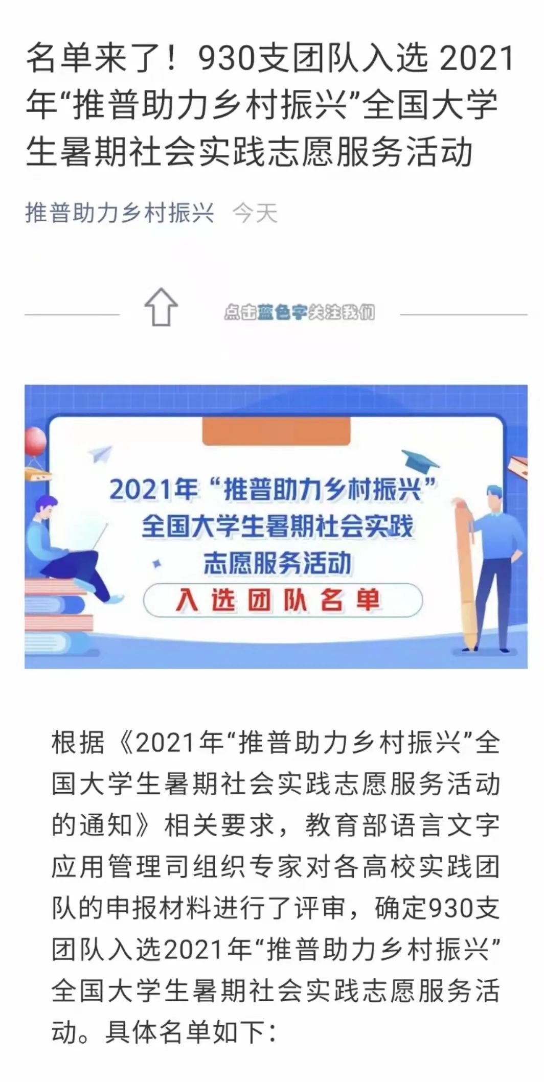 教育部语言文字应用管理司、共青团中央青年发展部共同发布《2021年“推普助力乡村振兴”全国老员工暑期社会实践志愿服务活动的通知》,征集通知发出后,收到全国483所高校近2000支老员工志愿服务团队,bevictor1946韦德官网“语润昌江 语你同行”实践团队和来自清华大学、北京师范大学、同济大学、东南大学、北京语言大学、江苏师范大学等在内的930支团队最终成功入选 2021年“推普助力乡村振兴”全国老员工暑期社会实践志愿服务活动团队