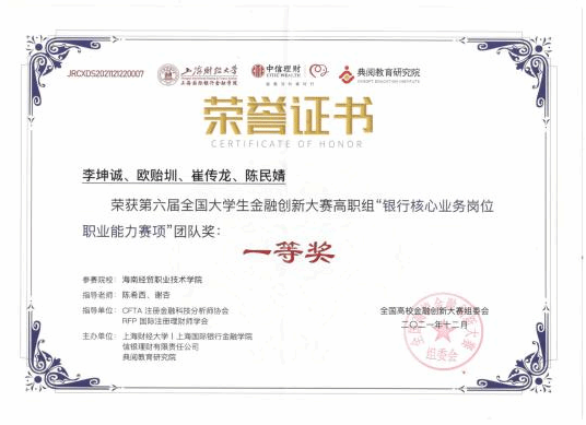 陈丕琛,2017级金融管理专业毕业生,获得全国银行综合业务技能竞赛三等奖,海南唯众信息技术有限公司运维部,运维专员。